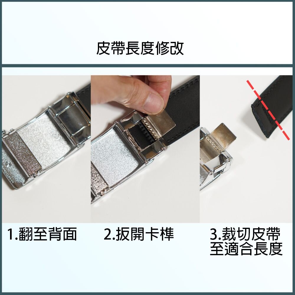 【皮帶規格】 皮帶頭:自動扣 帶頭材質:合金 皮帶身:時尚黑 帶身材質:真牛皮 長度:120cm 寬度:3.5cm
